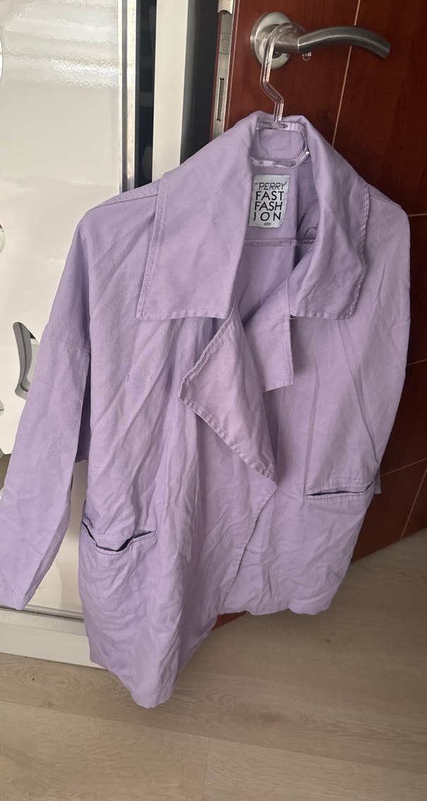 Mor pastel renkli, keten kumaştan yapılmış kadın ceket. Gevşek kesim, midi boy ve düğmeli. Notlu yaka ve uzun kollu, günlük şehir stili için uygun.
