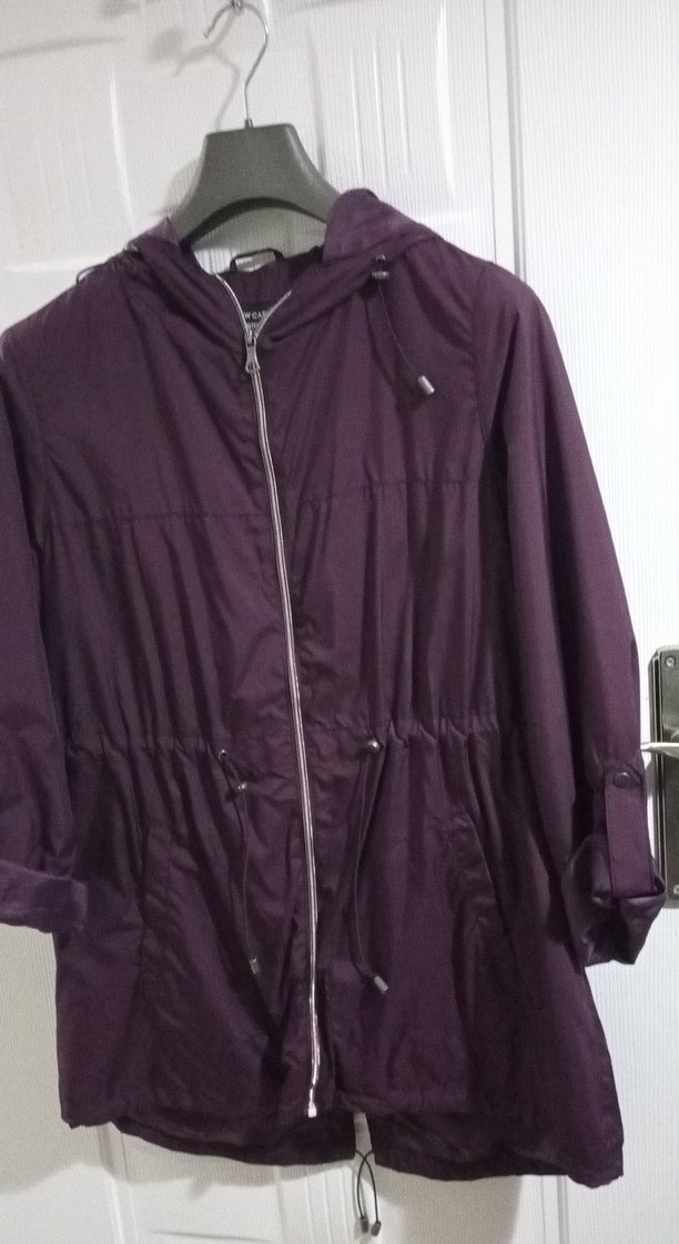 Mor midi uzunluğunda, parlak görünümlü, uzun kollu, yaka detaylı, fermuarlı ve bol kesim kadın ceket. Sentetik kumaştan, günlük sokak stiline uygun.