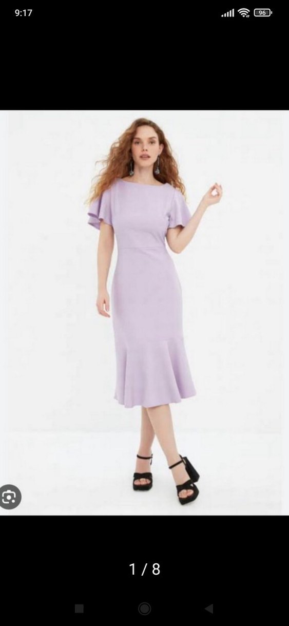 Mor midi boy elbise, kısa kollu ve tek renk. Yumuşak sentetik kumaştan, normal kesim ve volanlı etek ucu ile ofis için uygun, minimal ve şık görünüm sunar.