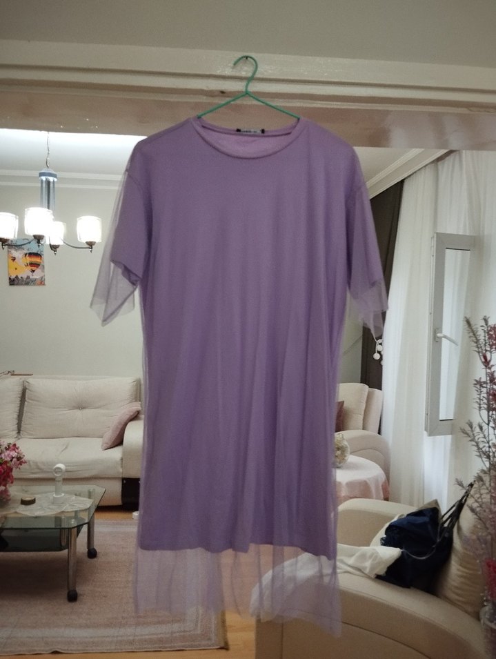 Pastel mor renkte, kısa kollu, yuvarlak yakalı ve bol kesim midi elbise. Üstünde tül katmanı vardır. Trendyol m beden