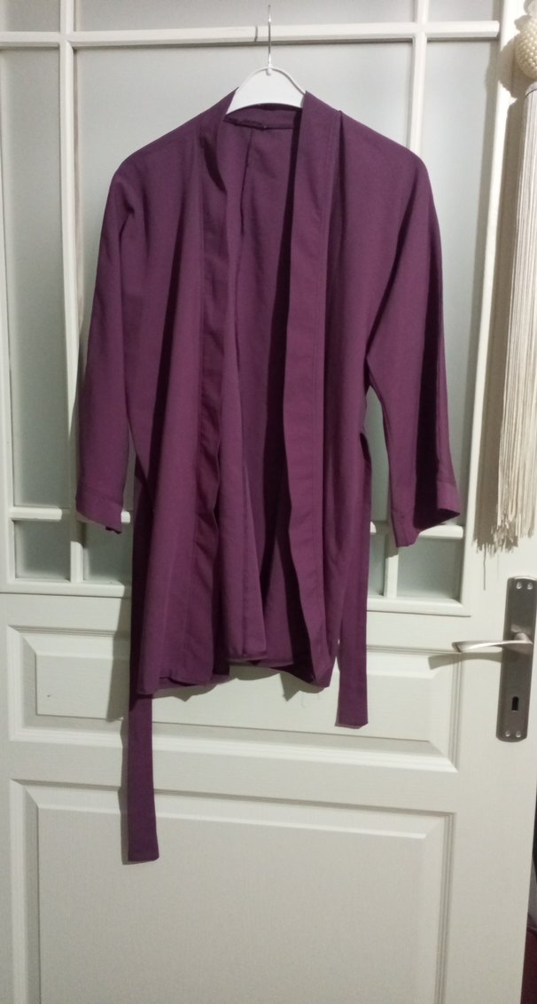 Mor renkli, midi boy kadın kimono rahat kesime ve uzun kollara sahiptir. Minimalist, normcore tarzda, desensiz ve koyu renklidir.