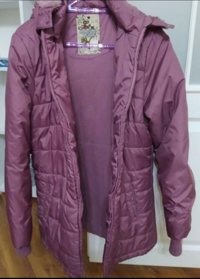 Mor renk, midi boy, fermuarlı, balıkçı yakalı ve uzun kollu, yumuşak sentetik kumaştan yapılmış kadın mont. Sokak stili ve rahat kullanım için uygun.