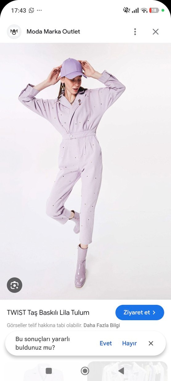 Pastel mor renkte, uzun kollu, rahat kesime sahip kadın tulumdur. Yumuşak sentetik kumaştan üretilmiş olup, günlük kullanıma uygun zahmetsiz şıklık sunar. 2 defa giyildi