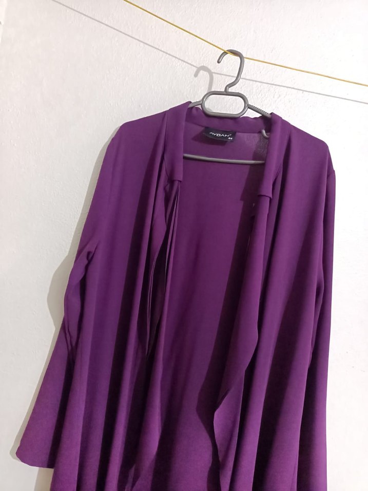 Mor renginde, midi boyda ve bol kesim kadın kaban. Uzun kollu, yakası kesik detaylı, satenimsi dokuda ve drapeli tasarıma sahip, minimal ve şık bir model.