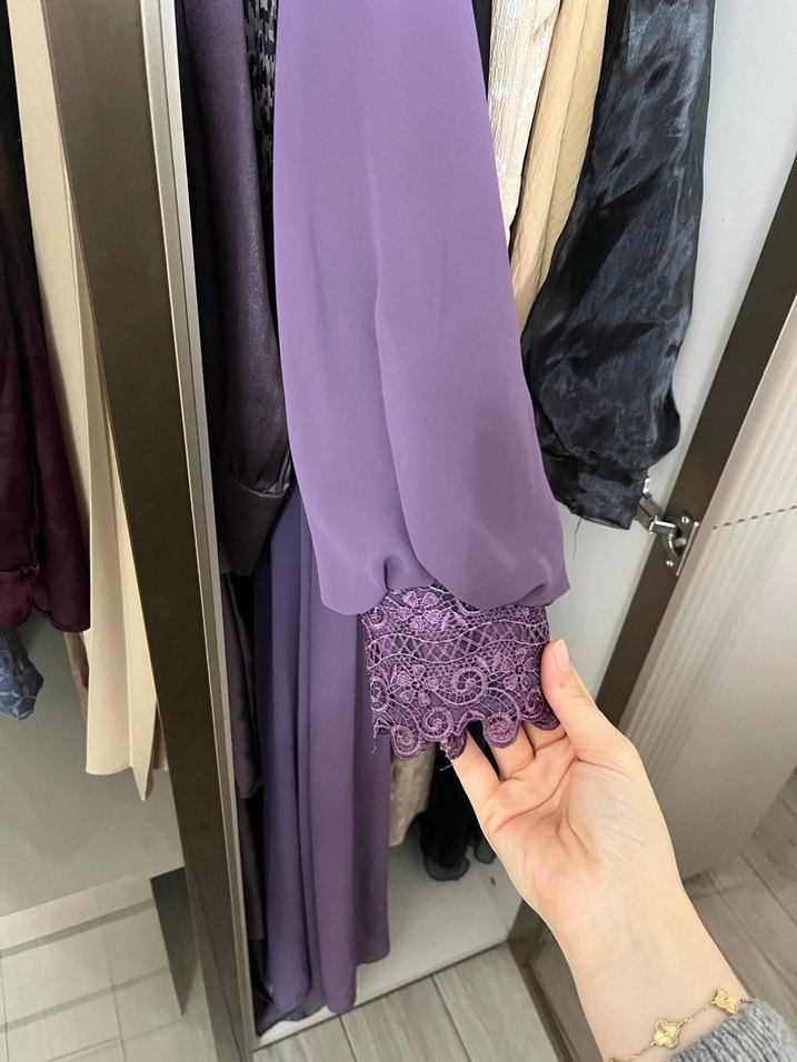 Mor renkte, uzun kollu ve dantel detaylı manşetlere sahip, Paris esintili gotik stil midi boy kadın giyçiği.