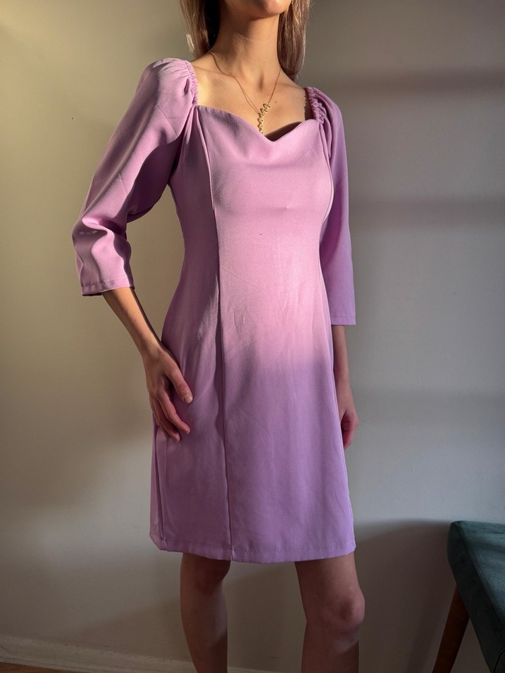 Mor midi boy, drapeli kalp yaka ve yarım kollu kadın elbise. Pastel ton ve hafif tie-dye deseniyle Paris tarzı, modern klasik görünüm sunar.