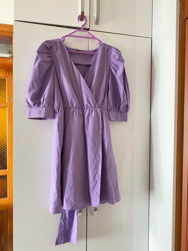 Pastel mor renkli, midi boy, bol kesim ve balon kollu kemerli kadın elbise. V yaka ve desen içermeyen sade tasarımıyla rahat bir kullanım sunar.