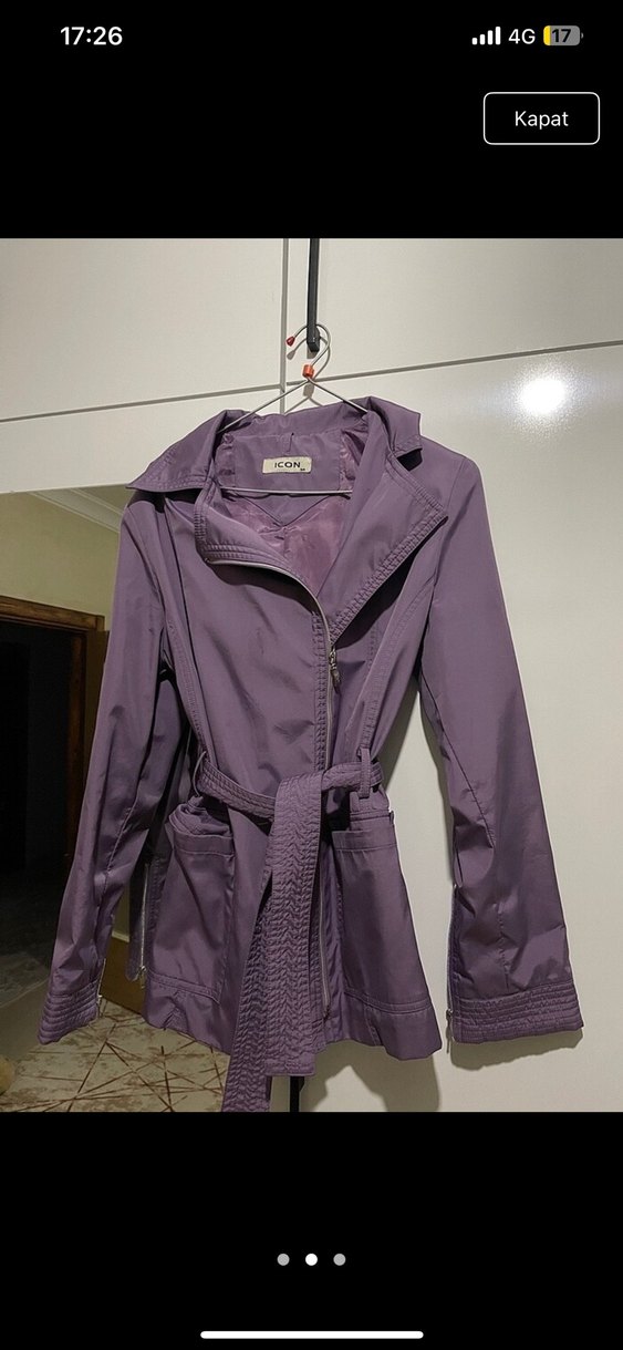 Parlak sentetik kumaştan, kemerli ve yakalı, mor renk midi uzunlukta kadın trençkot. İnce kesimli, askılı kollu, sokak stili uyumlu. .CON etiketi bulunur.