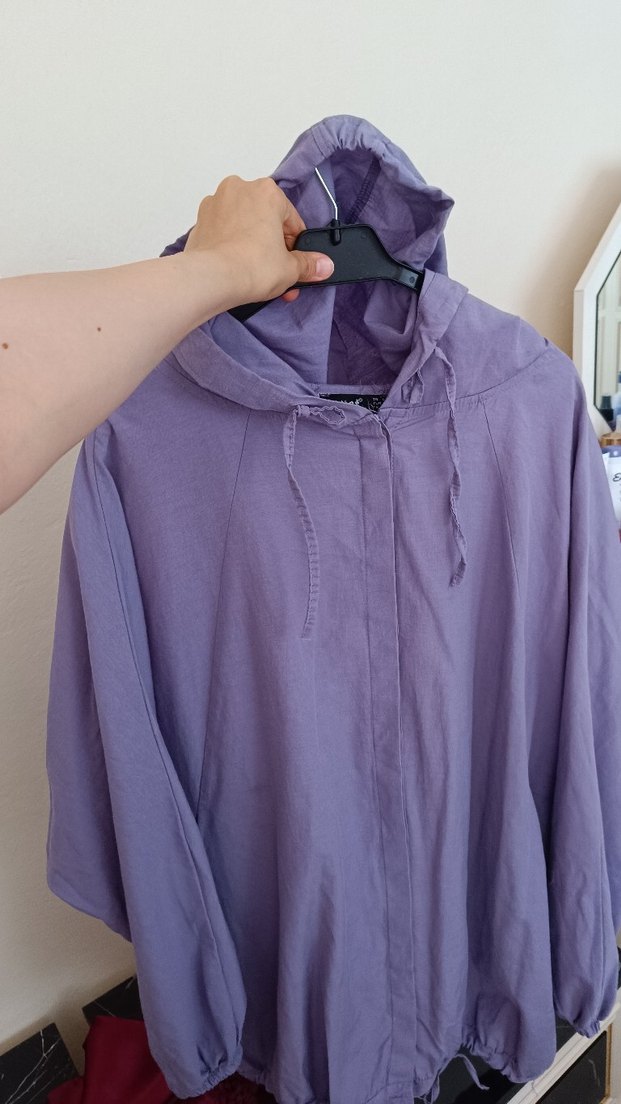 Mor renkte, keten kumaştan yapılmış, bol kesim, yüksek yakalı ve drapeli detaylı uzun kollu midi ceket yağmurluk gibi birşey.