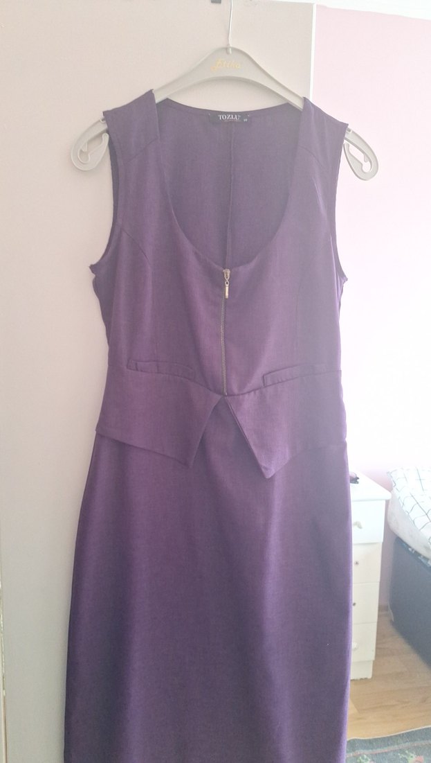 Kolsuz, önü fermuarlı, v yaka mor midi elbise. Sıkı kesim, sentetik kumaştan, belde hafif peplum detayıyla iş ve modern tarzlara uygun.