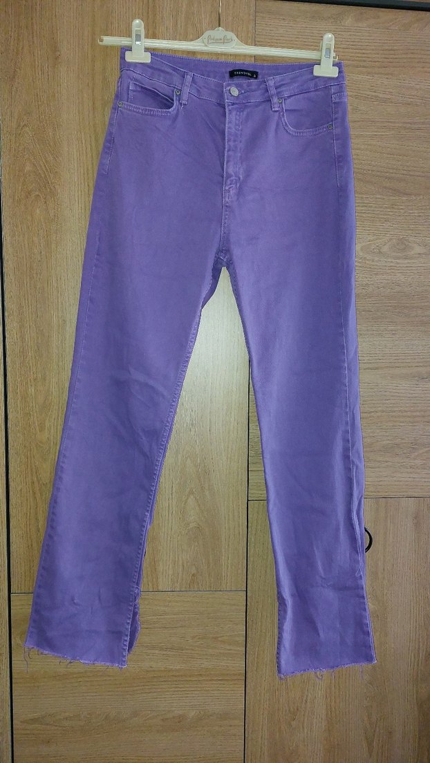 Mor, normal boy uzun kot pantolon, yırtmaç detaylı, rahat ve günlük kullanım için uygun. Pastel renk trend bir görünüm sağlar.