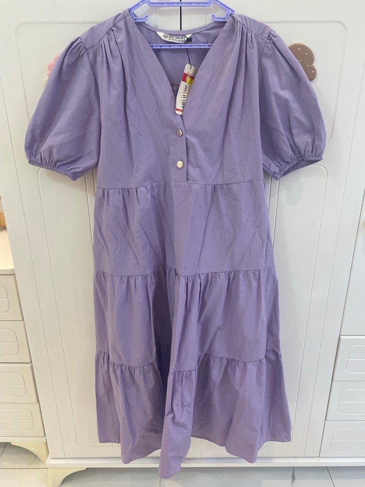 Yumuşak pamuktan yapılmış, kısa kollu ve V yakalı, bol kesim mor midi elbise. Düğme detayları ve bohem tarzı bulunur. Günlük kullanıma uygundur.