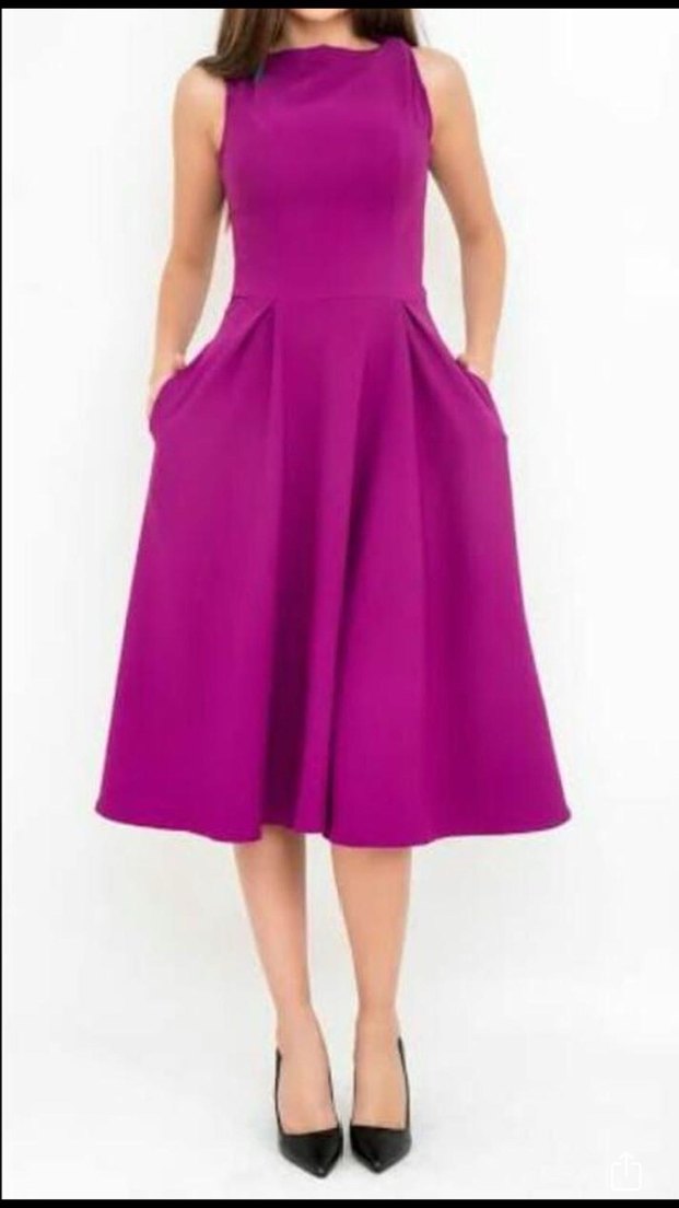 Kolsuz, tek renkli mor midi elbise, tekne yaka ve piliseli geniş etek detayına sahiptir. İpek gibi parlak kumaştan, ofis için cesur bir seçimdir. Ürünü iki kere giyindim iyi durumda