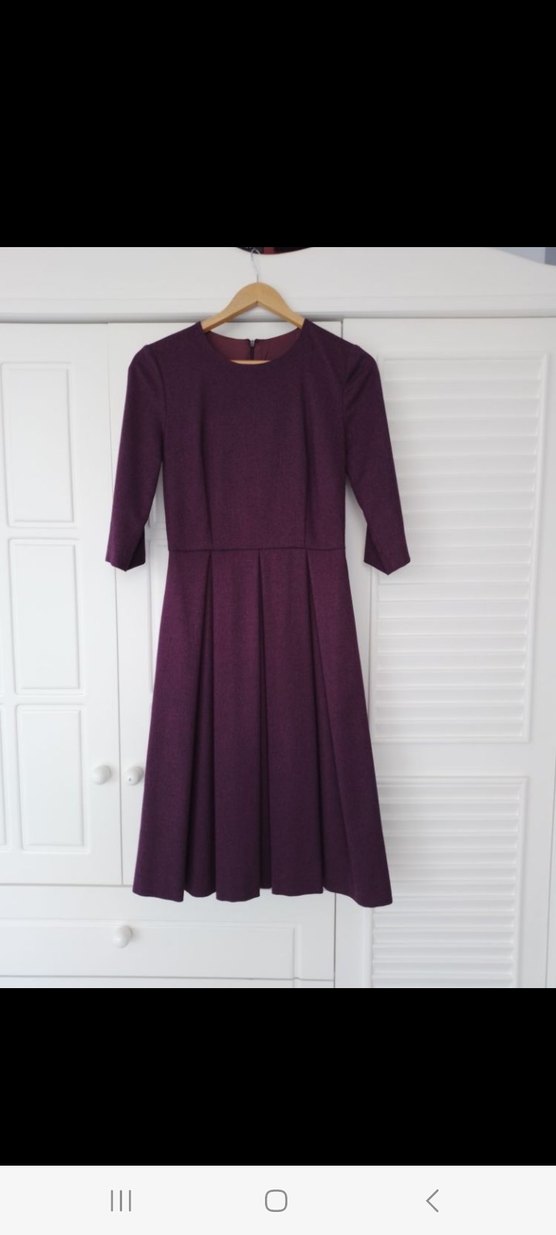 Koyu mor renkte, yuvarlak yakalı ve 3/4 kollu kadın kumaş elbise. Piliseli midi etek kısmı, modern klasik bir dokunuş sağlar. Ofis için uygun, kaliteli kumaştan yapılmıştır.