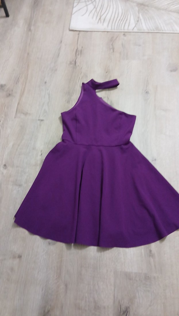 Mor midi boyda, straplez yakalı ve askılı, drapeli kadın elbisesi. İnce kesimi ve minimalist gotik tarzıyla parti için uygun.