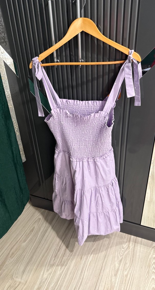 Fiyonklu ince askıları, straplez yaka ve fırfır detaylarıyla sade bohem tarzda, pastel mor tonlarında midi uzunlukta, hafif sentetik kumaştan yapılmış dar kesim elbise.