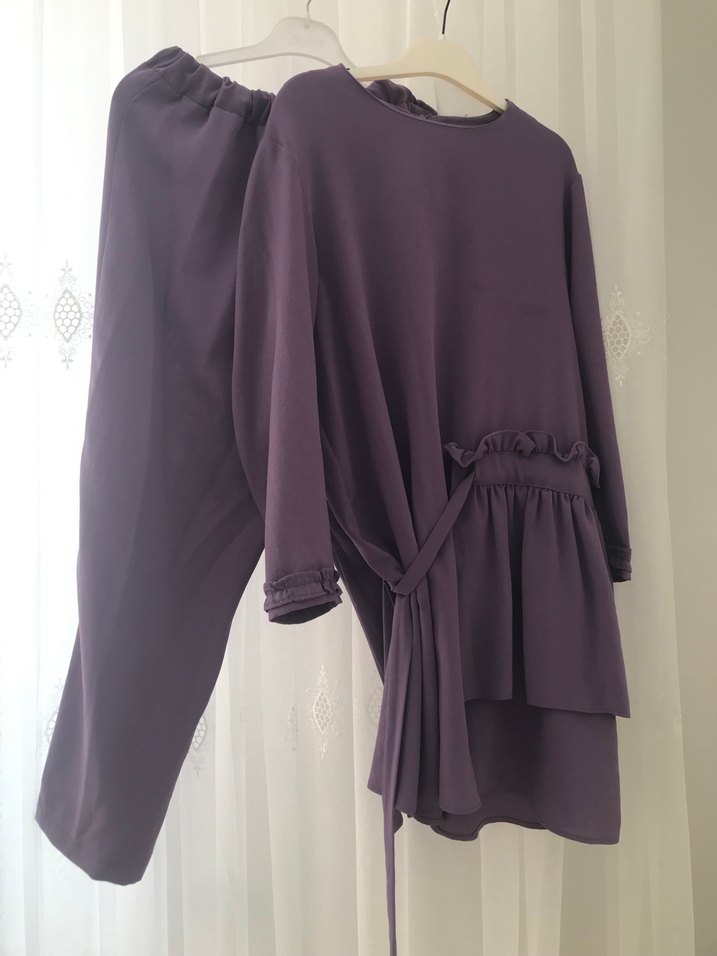 Mor renkli, uzun kollu ve yuvarlak yaka takım.İpeksi kumaştan, ayrobin kumas salaş kesim ve drapeli detaylı, günlük kullanıma uygun sade tasarım.