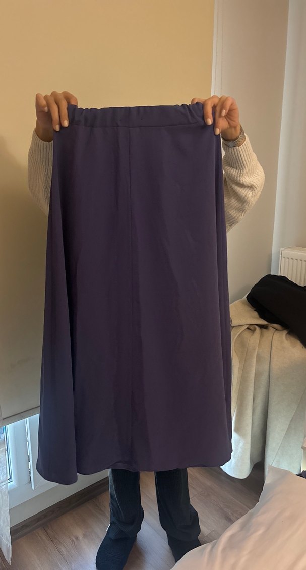 Mor renkte, midi boy uzunlukta ve drapeli tasarıma sahip bol kesim kadın eteği. Yumuşak sentetik kumaştan üretilmiş, sade ve rahat bir modeldir. Takım alt üst