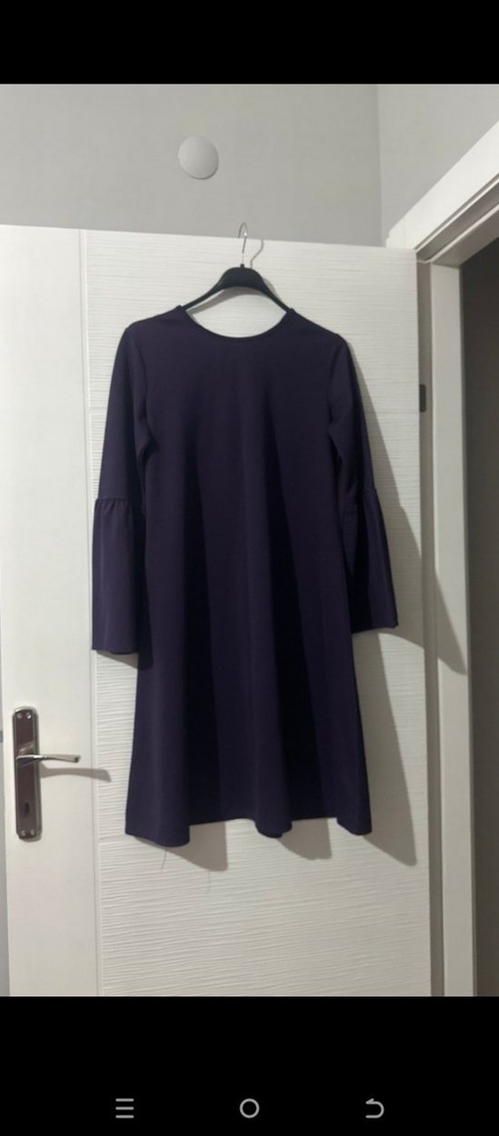 Mor midi uzun kollu tunik, pilili detaylı, bol kesim ve yuvarlak yaka. Sentetik kumaştan, günlük kullanım için uygundur.