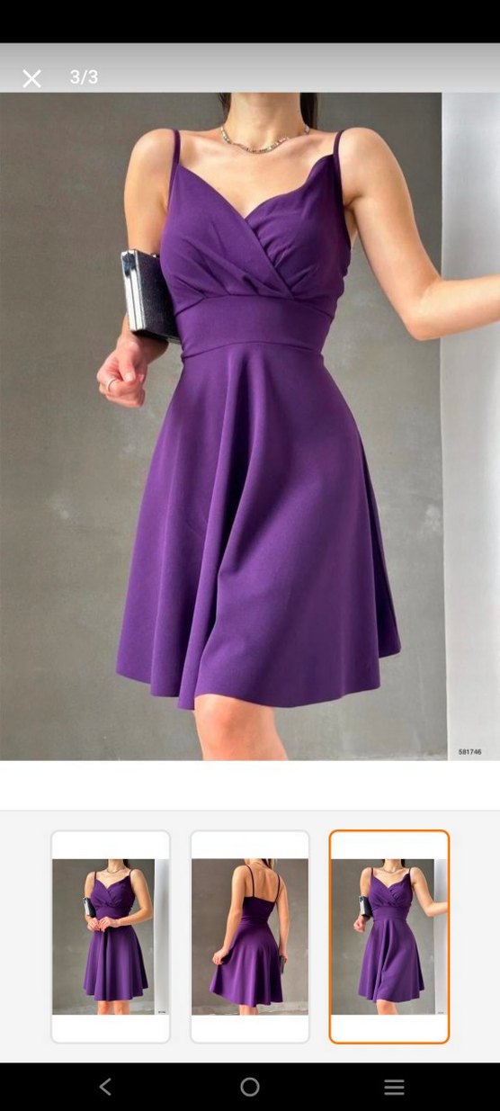 Mor renkli, V yaka ve ince askılı, pile detaylı, klasik tarzda midi boy kısa abiye elbisedir. Ofis için uygundur. Marka temsilidir