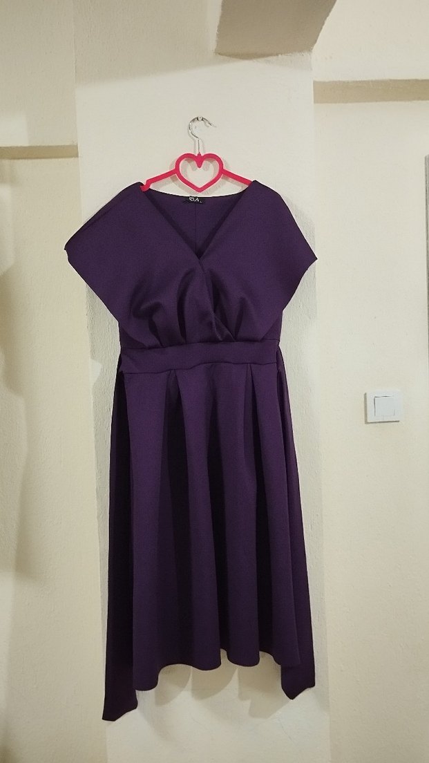 Mor midi elbise, V yaka ve kolsuz, salaş kesim ve drapeli tasarımla minimalist ve şık goth tarzını yansıtıyor. Günlük kullanım için uygundur.