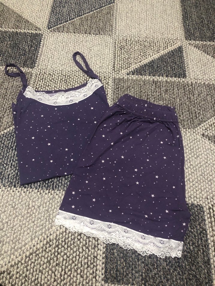 Mor renkli, nakışlı yıldız desenli kısa askılı, dantelli şık ve rahat pijama takımı. S M L XL bedenleri mevcuttur.