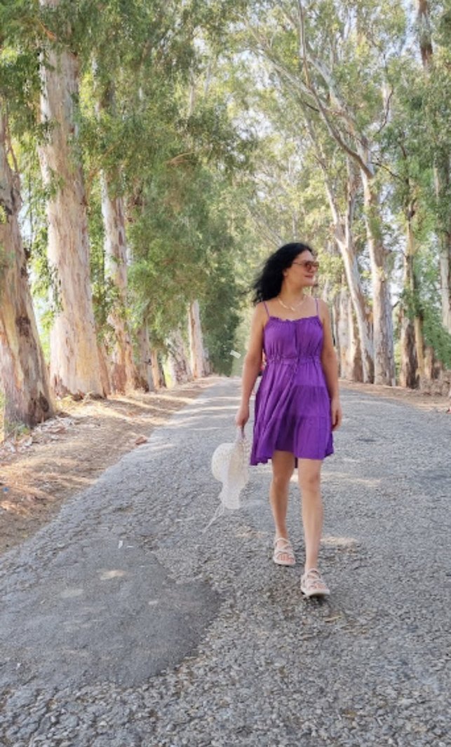 Mor mini elbise, straplez yaka ve ince askılarla bol kesim. yumuşak parlak kumaş, tie-dye desenli ve transparan detaylı, açık hava kullanımı için uygun.