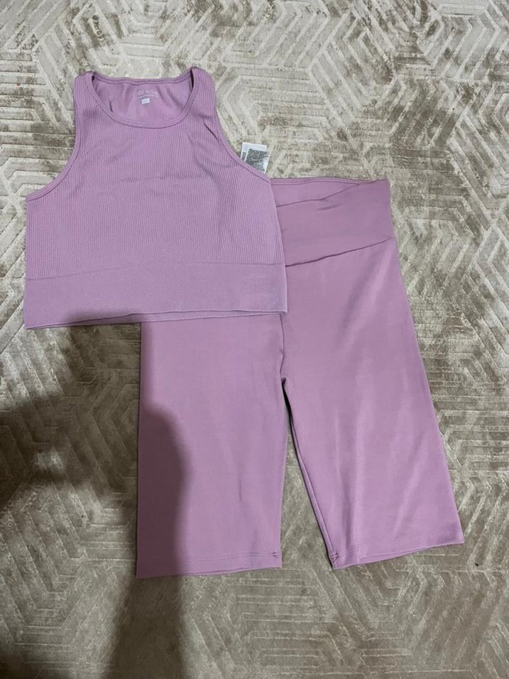 Mor pastel tonlarında, fit kesim, kolsuz crop top ve şorttan oluşan yumuşak sentetik kumaş spor takımı. Spor aktiviteleri için rahat ve şık.