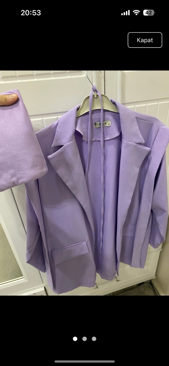 Mor pastel renginde, kısa mini boyda, uzun kollu, kesik yaka ve düz desensiz, regular fit kadın blazer cekettir. Şalı birlikte gönderilecektir