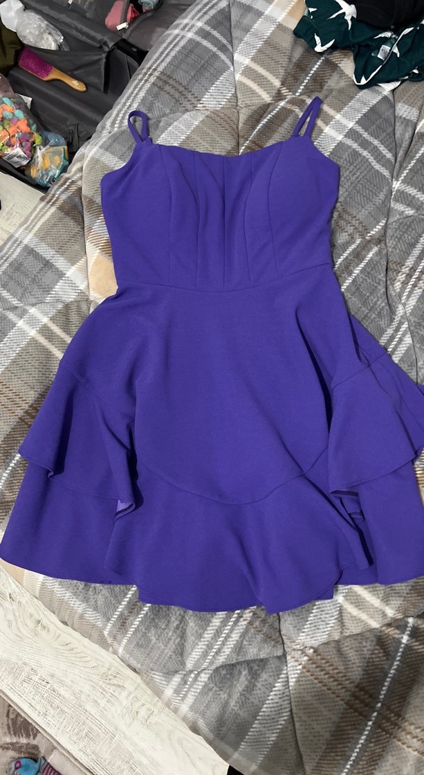 Parlak kumaştan, ince askılı, sırt dekolteli mor mini elbise. Fitted kesim ve fırfır detaylarla parti için uygun şık bir model. 1 kere giyildi.1 beden.Arkadan uzunluk 60 cm,önden 68 uzunluk.Bel genişlik 33 cm.Göğüs kısmı kaplı.