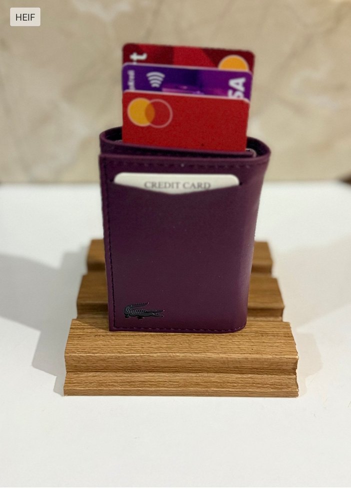 Koyu mor renkte minimalist erkek cüzdanı, baskılı desene sahip ve temel kartlar için bölmeler içerir. Sade, düz ve karşı kültür tarzında.