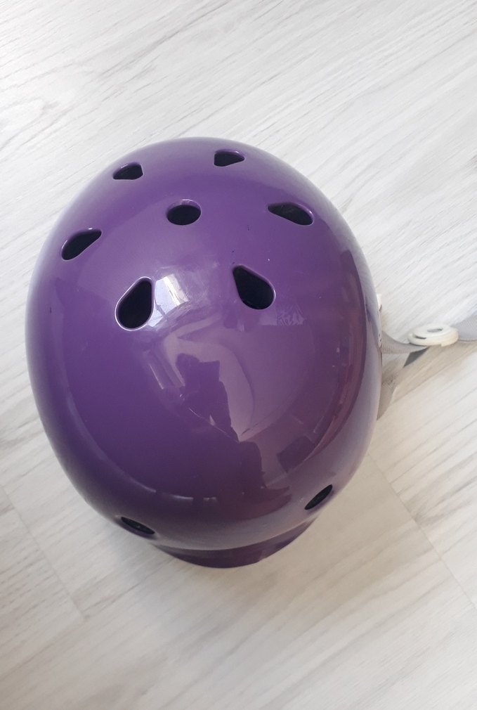 Mor renkte, plastikten yapılmış motosiklet kaskı. Çoklu havalandırma delikleri ve desensiz, minimalist tasarımıyla sade bir görünüm sunar. ️