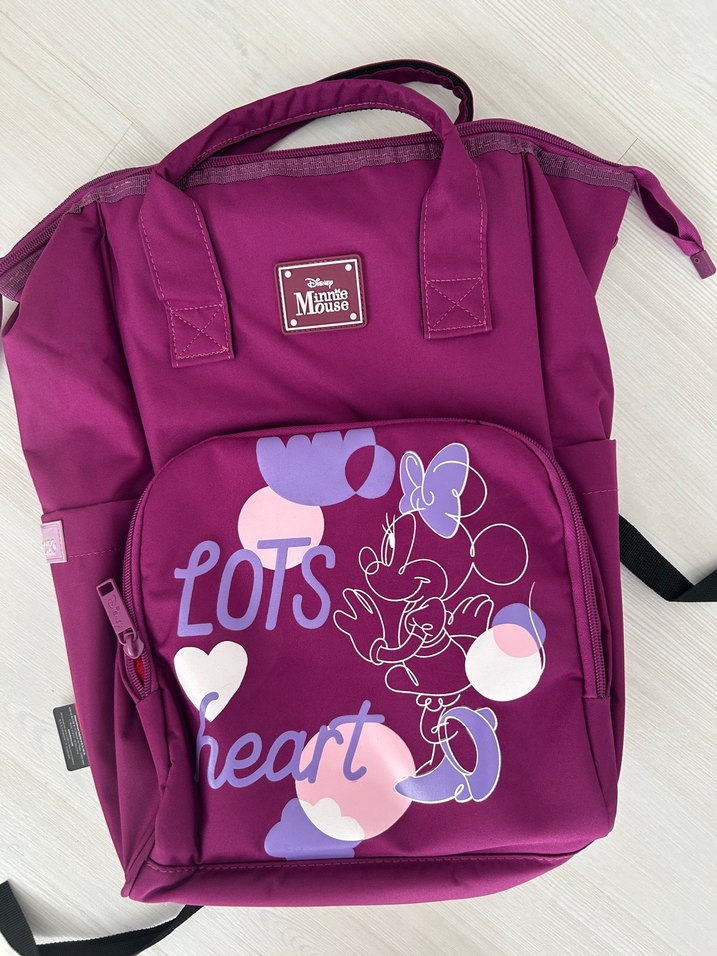 Renkli mor çocuk okul çantası, ön cepte Minnie Mouse figürü ve "LOTS heart" yazısı bulunur. Dayanıklı kulplar ve ayarlanabilir askılar içerir.