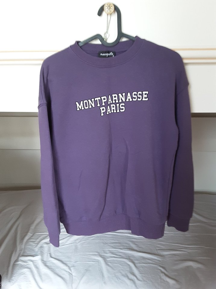 Mor renkli, uzun kollu ve yuvarlak yaka sweatshirt. Önünde "MONTPARNASSE PARIS" baskısı bulunan, rahat ve salaş kesim. Günlük kullanım için uygun, yumuşak ve sıcak kumaştan üretilmiştir.