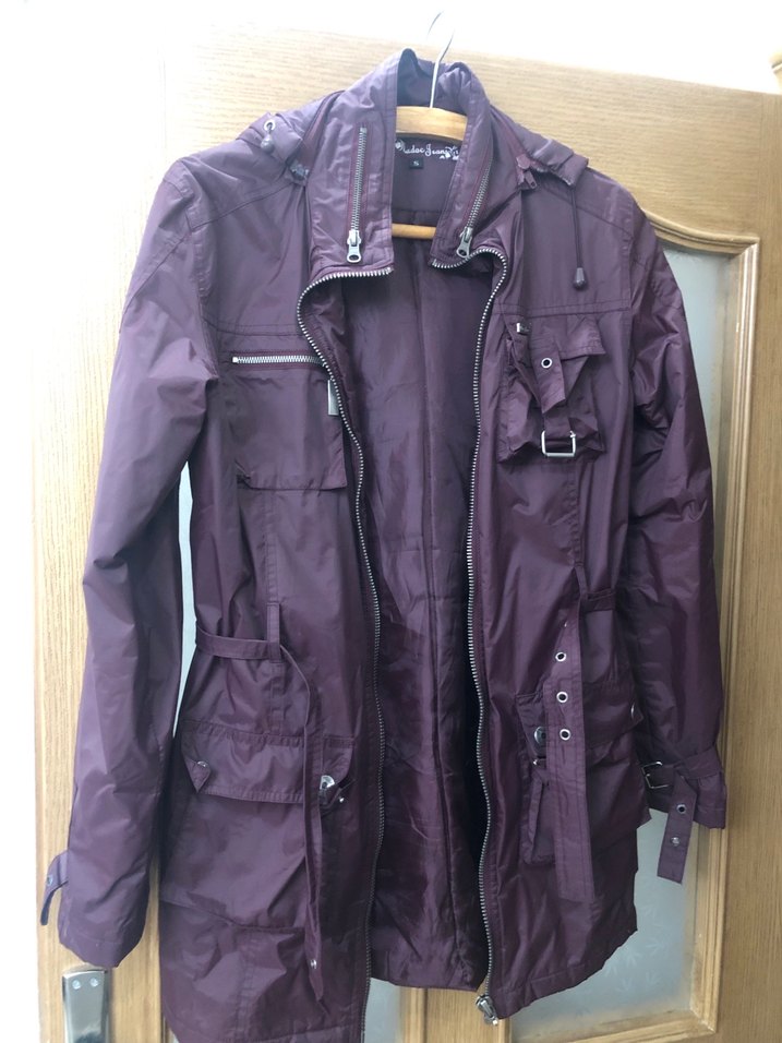 Mor, oturtmalı kesime sahip, çıtçıtlı ve tokalı detaylı, askılı kollu, normal midi uzunlukta kadın ceket. Parlak sentetik kumaşıyla günlük sokak stiline uyum sağlar. Kemerin tokası düşmüş ben bağlayarak kullanıyorum. O yüzden uyguna verıyorum