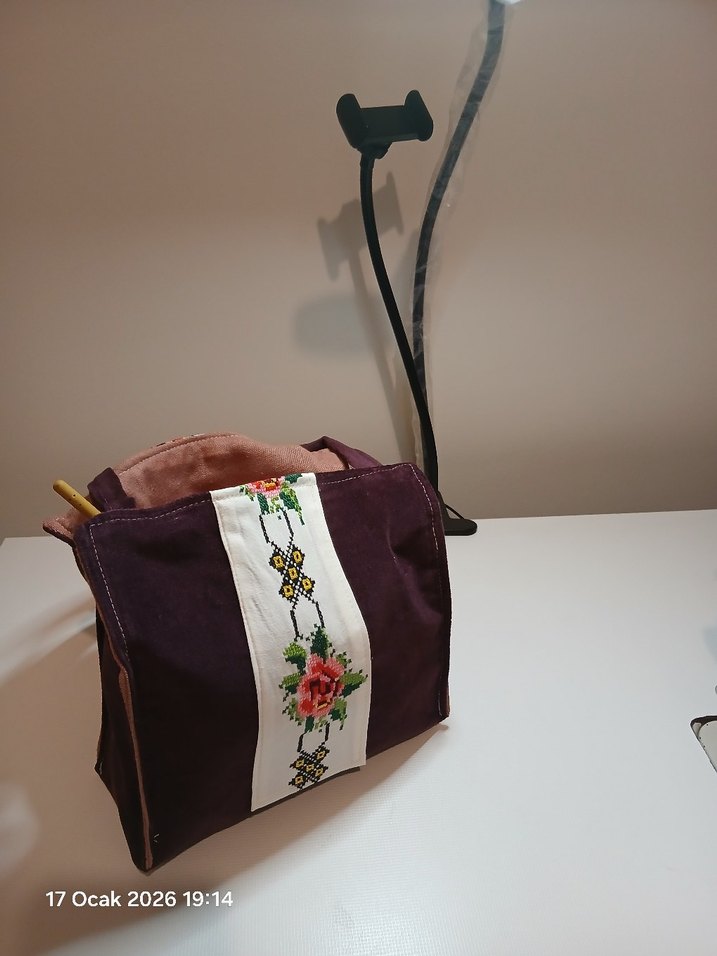 Koyu mor renkli, nakışlı desenlere sahip, bohem tarzda elişi çantası.