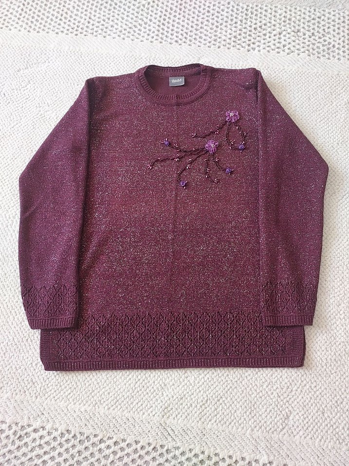 Mor renkli, uzun kollu, yuvarlak yakalı, nakışlı bohem tarzda kadın triko kazak. İnce ve normal boyda, rahat ve şık bir görünüm sunar. simli ipten örülmüş çok şık