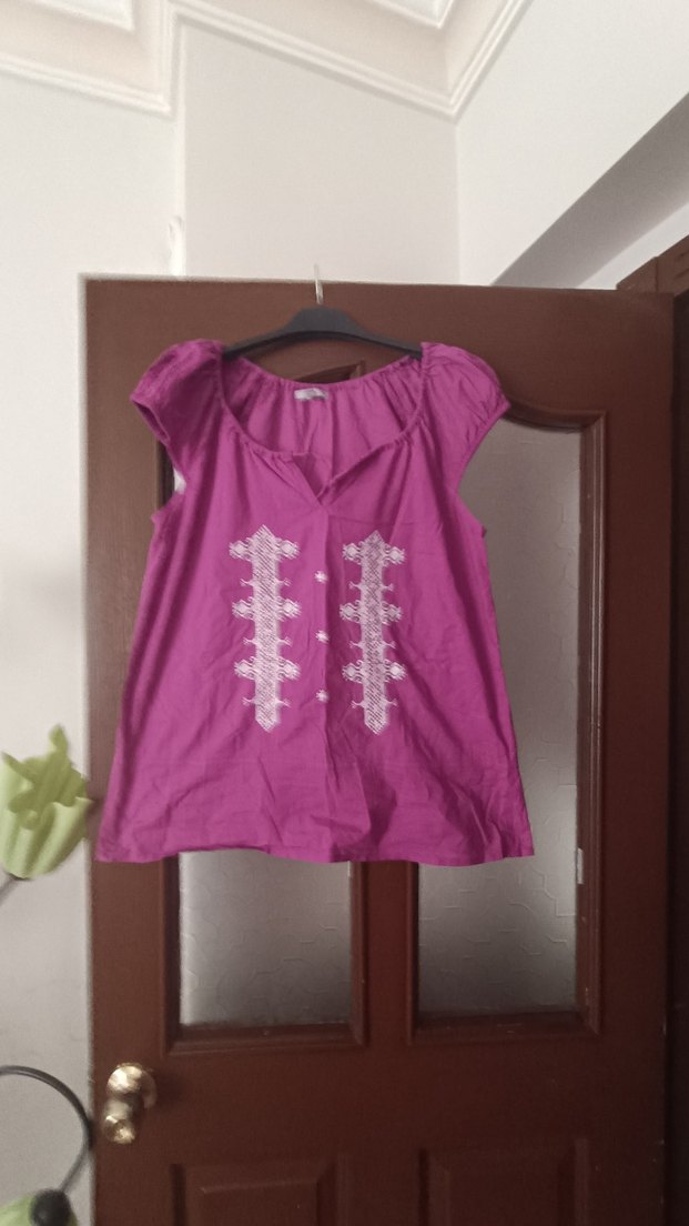 Mor pastel tonlarda, kısa kollu, V yakalı, nakış detaylı ve düğmeli bol kesim kız bluzu.