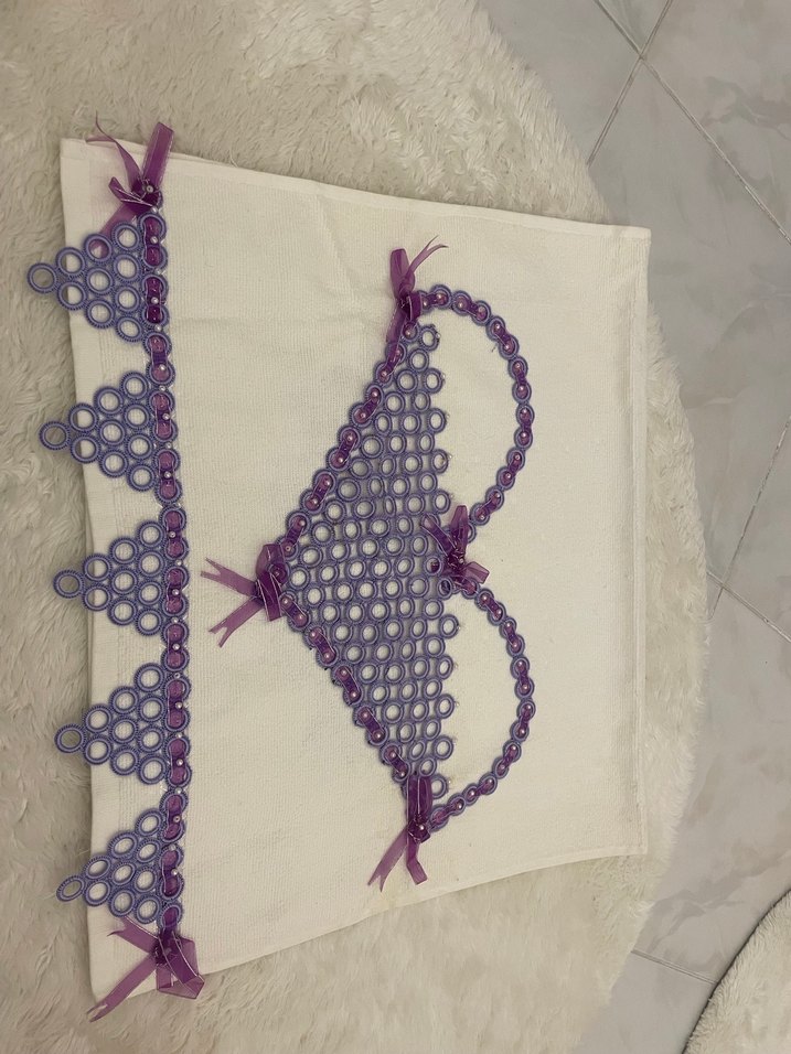 Hafif mor renkte, uçlarında üçgen nakış ve kurdele detayları bulunan bohem tarzı havlu. Hiç kullanılmadı hafif lekesi var