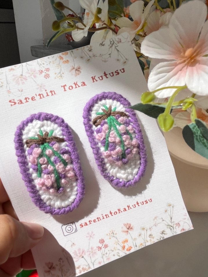 Mor nakışlı ve boncuk detaylı, pastel renkli bohem tarzda çocuk saç tokası. Yumuşak iplikten el yapımı, zarif bir dokunuş sağlar.