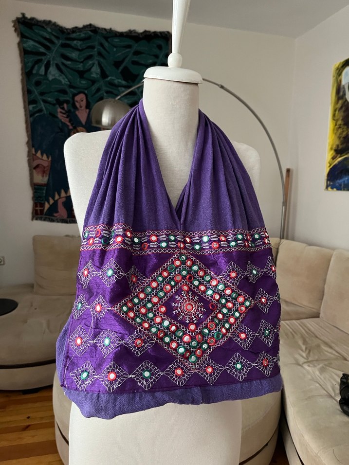 Mor renkli, nakışlı ve boncuk işlemeli tekstil kadın çantası, bohem tarzda günlük kullanım için uygundur.