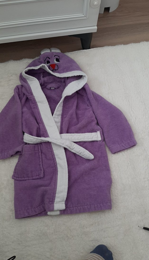 Mor kapüşonlu çocuk bornozu, nakışlı yüz detayıyla. Yumuşak ve sıcak kumaştan, kemer ve cep içerir.hic kullanılmadı