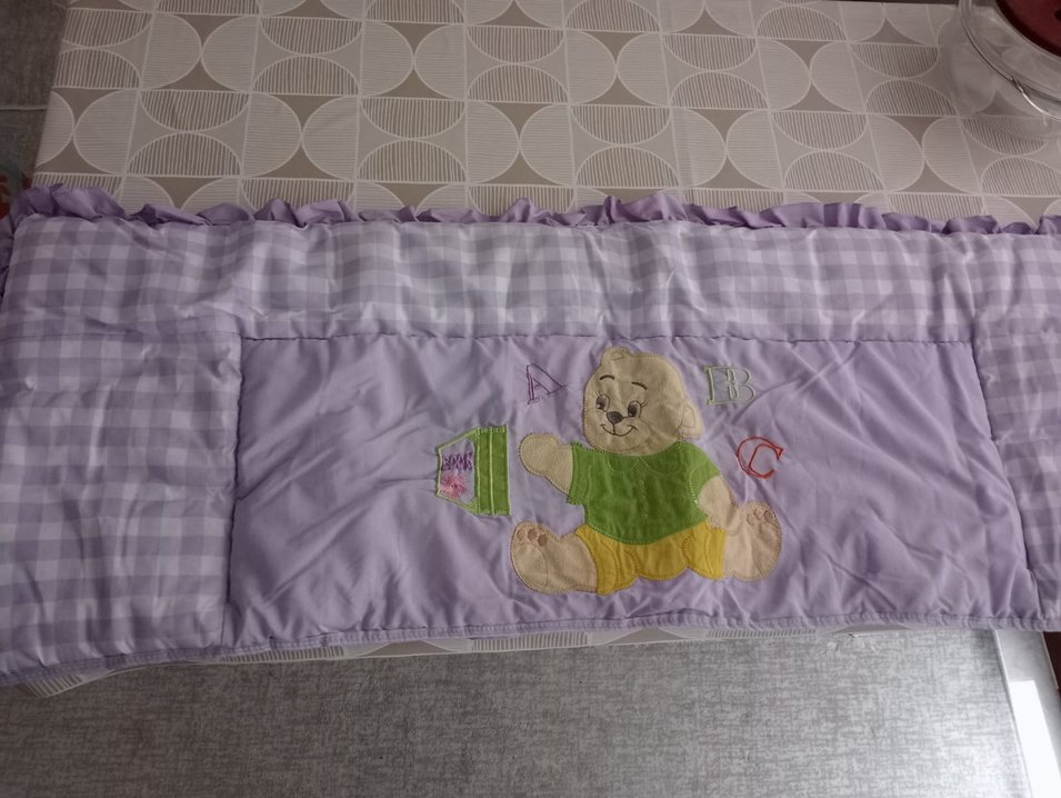 Sentetik kumaştan yapılmış, mor pastel renkte, ayıcık ve harf nakışlı çocuk uyku aksesuarı.