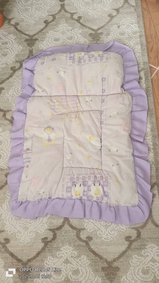 Mor nakışlı desenlere sahip yatak, yumuşak sentetik kumaştan yapılmış, fırfırlı kenarları olan çocuk uyku örtüsüdür.