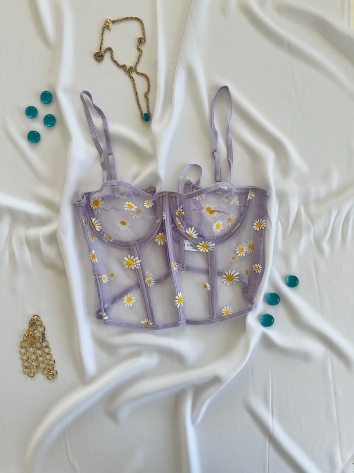 Nakışlı papatya desenleri ve dantel detaylı, mor renkli, kısa bohem stilinde, askılı ve straplez yaka, fitted mini büstiyer. S/M/L/XL mevcuttur.