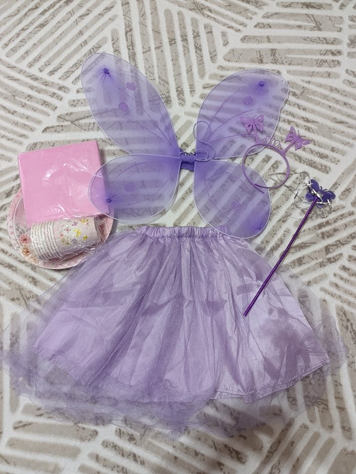 Pastel mor tonda, nakışlı kelebek kanatları, dantel etek ve uyumlu asa ile başlık içeren bohem tarzda set .Tabak bardak peçete hiç kullanılmadı
