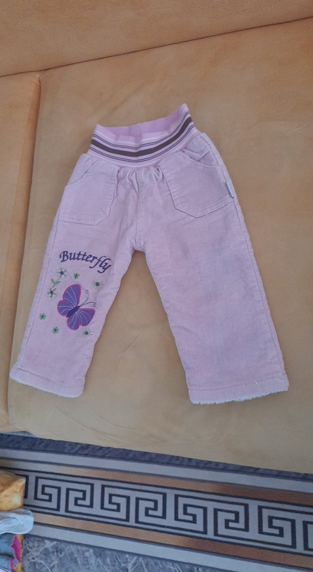 Mor, nakışlı kelebek desenli, düğmeli, bol kesim kız pantolonu. Yumuşak ve sıcak kumaştan, günlük sokak stili için uygundur.