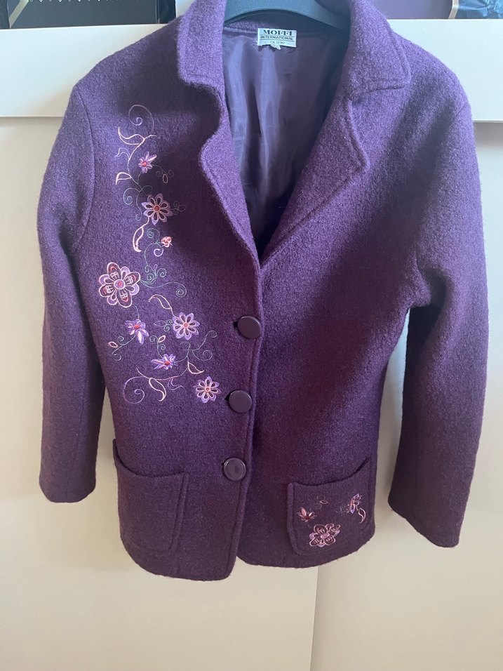 Mor renkte, düğmeli ve nakışlı çiçek desenli yün ceket. Normal uzunlukta, uzun kollu ve ofis için uygun rahat kesim. Gerçek keçe yün kumaştır