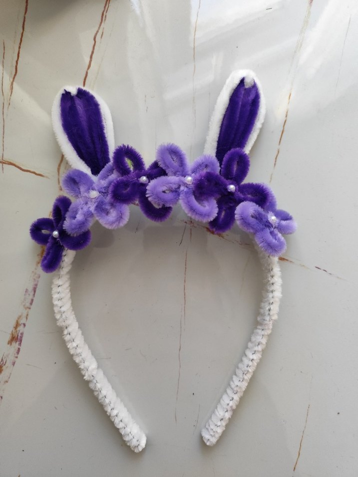 Mor elastik taç, nakışlı çiçekler ve tavşan kulaklarıyla renkli ve bohem tarzda çocuklar için uygun.