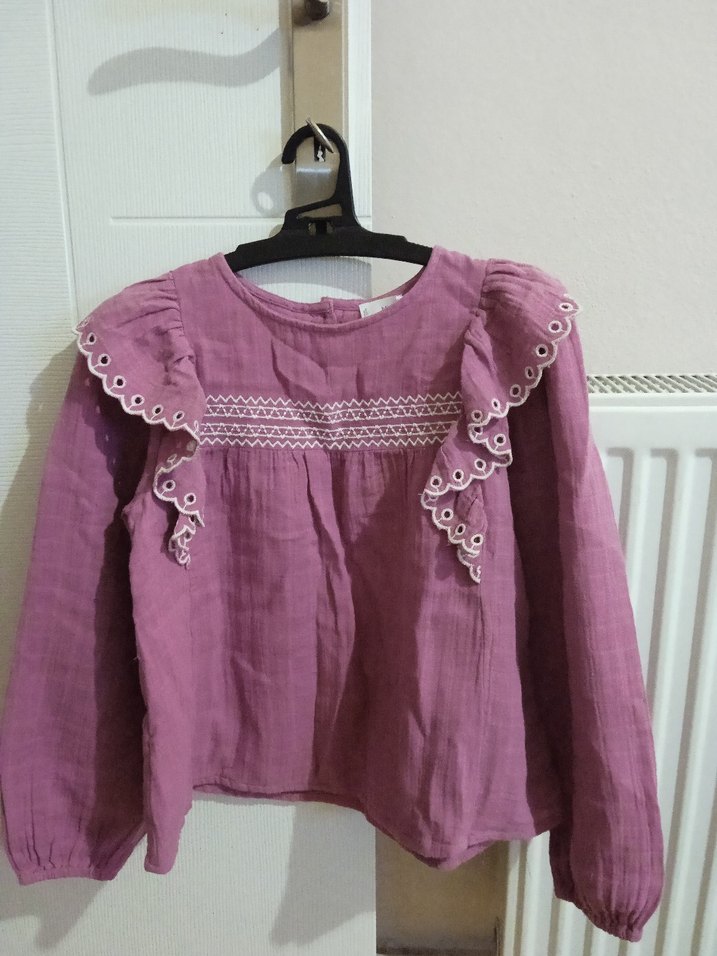 Bol kesim, uzun kollu mor bluz, fırfır detaylı ve nakışlı desenlere sahip. Pamuklu yumuşak kumaştan, bohem tarzda.